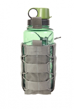 Taskun sivut ovat lipastaskuista poiketen leveä nailonhihnaa, jotka venyvät reilusti joustavan korsettinyörityksen avulla tarpeen niin vaatiessa. Nyöritystä voi säätää kitkalukon kautta halutulle kireydelle taskun takaa. Varmistuslenkki, joka lipastaskuissa on valinnainen lisävaruste, tulee pehmo-TACO:ssa vakiovarusteena ja se toimii esimerkiksi Liberty Bottlen kanssa mainiosti kuten kuvasta näkyy. Taskuun sopii myös 525-, 800- ja 1182 ml Klean Kanteen moitteettomasti eikä massiivinen litran Nalgenekaan pistä vastaan.